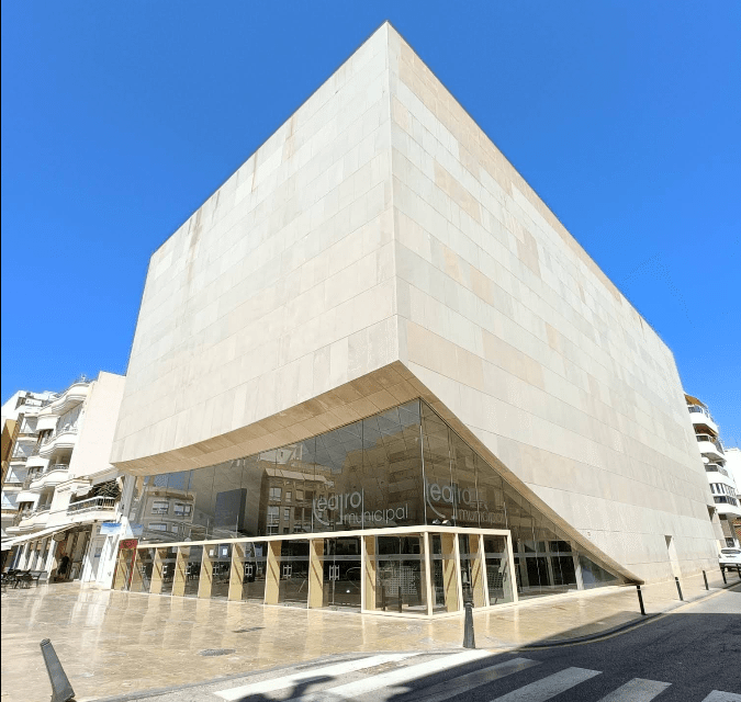 Municipal Theater of Torrevieja (Teatro Municipal) is a modern cultural venue in the city’s heart, designed by architects Alejandro Zaera Polo and Antonio Marqueríe Tamayo. It has a main performance hall with a capacity of 650 seats, plus a 400 m² rehearsal room, VIP lounge, multiple dressing rooms, and multifunctional spaces. The theater hosts a wide variety of shows, from musicals and concerts to dance and local productions, and is equipped with modern stage technology.